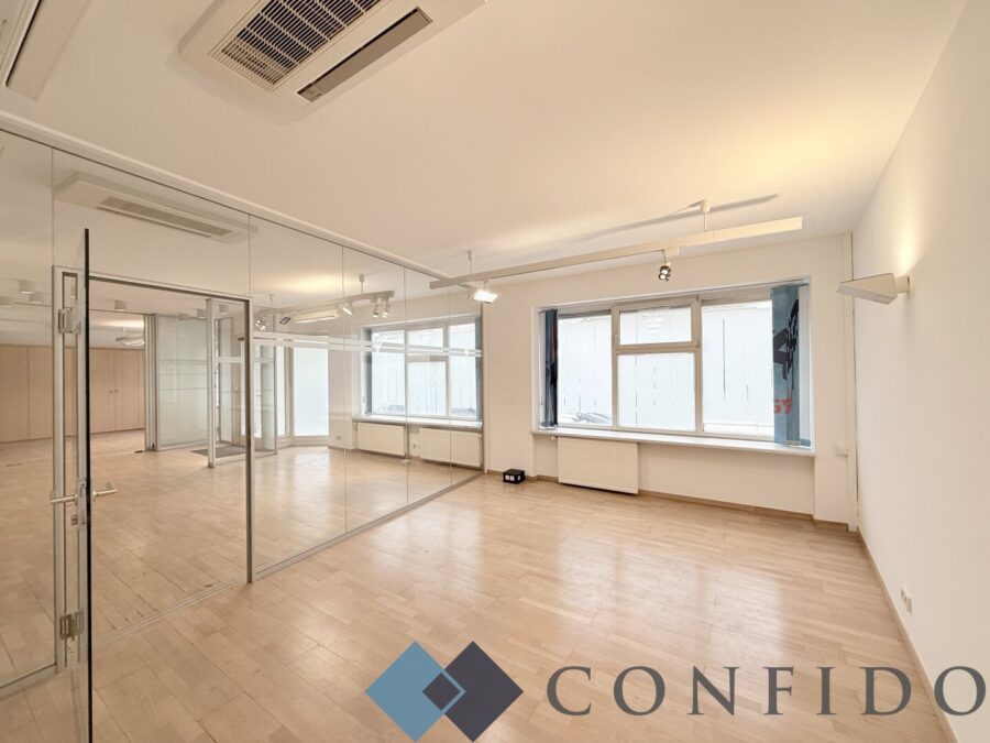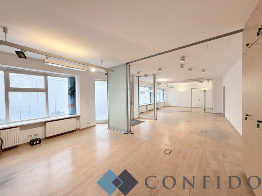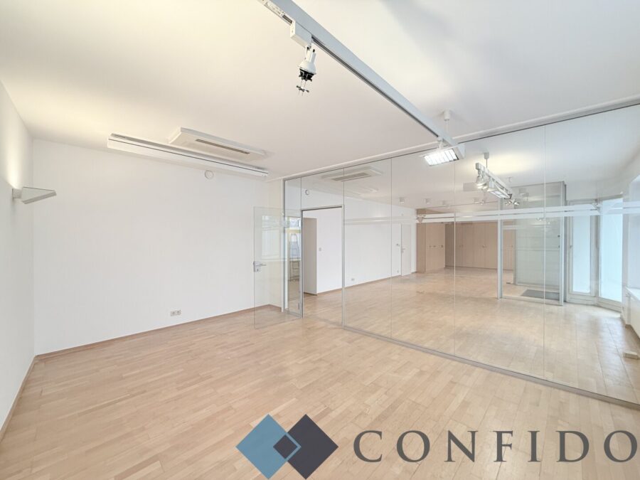 Das Objekt verfügt über einen großzügigen vorderen Bereich mit einer klimatisierten Fläche von etwa 80 m², der durch eine Glaswand bzw. ein weiteres Glasschiebemodul flexibel gestaltet werden kann. Dadurch besteht die Möglichkeit, den Raum bei Bedarf in bis zu drei separate Einheiten zu unterteilen, was eine vielseitige Nutzung ermöglicht.