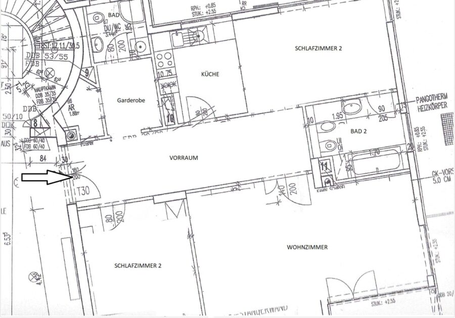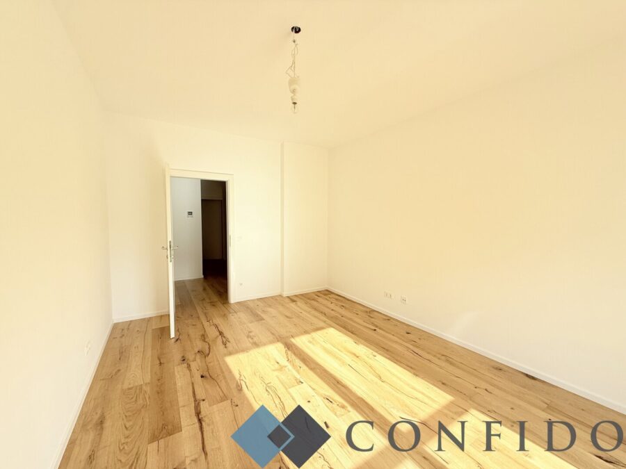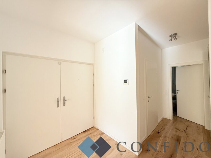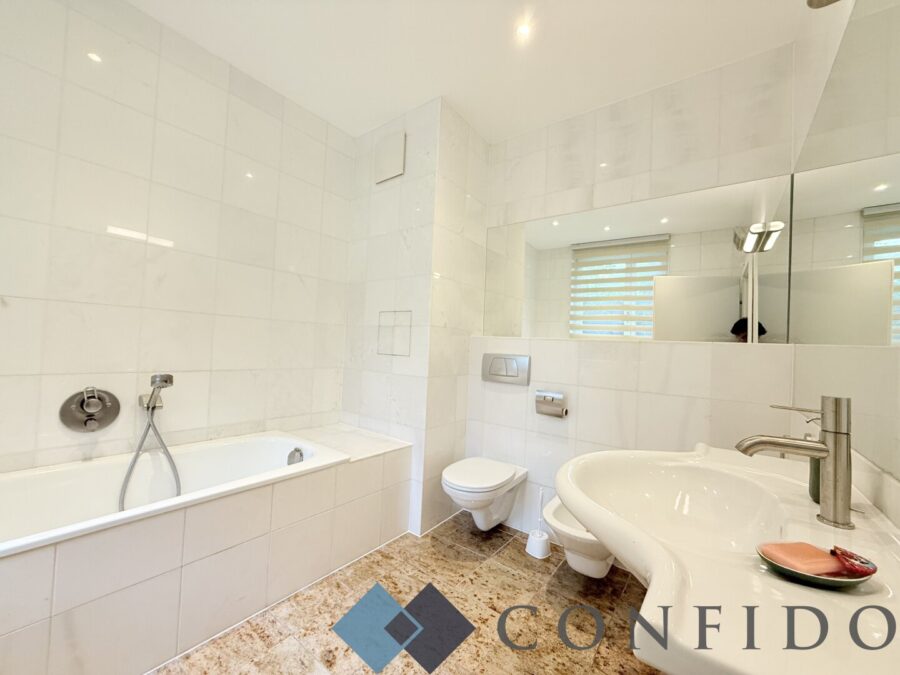 Im vorderen Bereich befindet sich ein rund 17 m² großes Schlafzimmer. Das zweite Schlafzimmer verfügt über ein En-Suite-Badezimmer mit Badewanne und Toilette, während ein weiteres Badezimmer mit Dusche und WC ausgestattet ist. Die Küche ist vollständig eingerichtet und separat begehbar. Ein Abstellraum sowie der großzügige, etwa 16 m² große Vorraum komplettieren den durchdachten Grundriss der Wohnung.