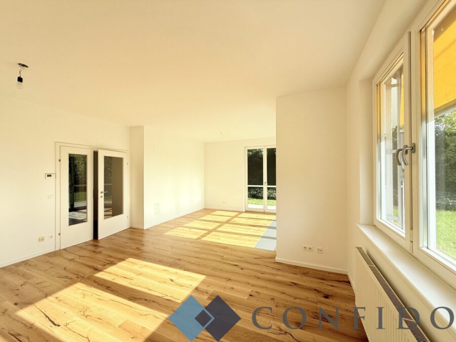 Das Herzstück der barrierefreien Wohnung ist das etwa 33 m² große Wohnzimmer mit Blick in den weitläufigen Garten, der die Wohnung nahezu rundum umschließt. Erst kürzlich wurde ein hochwertiger Echtholz-Dielenboden verlegt, der dem Wohnraum eine warme und elegante Atmosphäre verleiht. Von jedem Zimmer aus besteht ein direkter Zugang in den Garten, der durch seine Größe und Helligkeit ein besonderes Wohngefühl vermittelt.