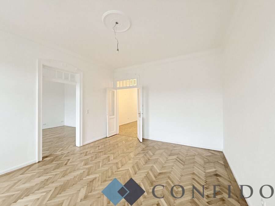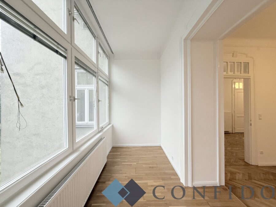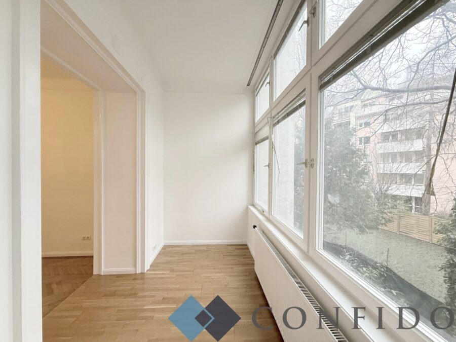 Tolle Raumhöhen, wunderschön revitalisierter Echtholzparkettboden und ein altbautypischer, großzügiger Grundriss und eine hofseitig verglaste Veranda.